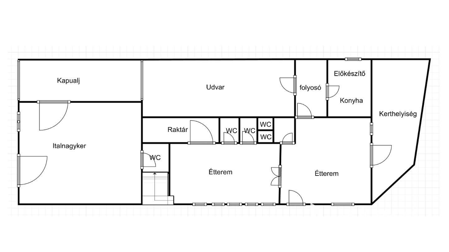 A kétszintes épület alsó szintjén kb. 100 főt befogadó étterem található, mely az előírásoknak megfelelő konyhával, és a hozzátartozó helyiségekkel rendelkezik.
