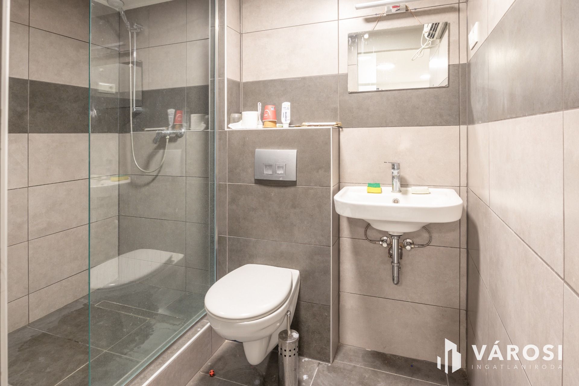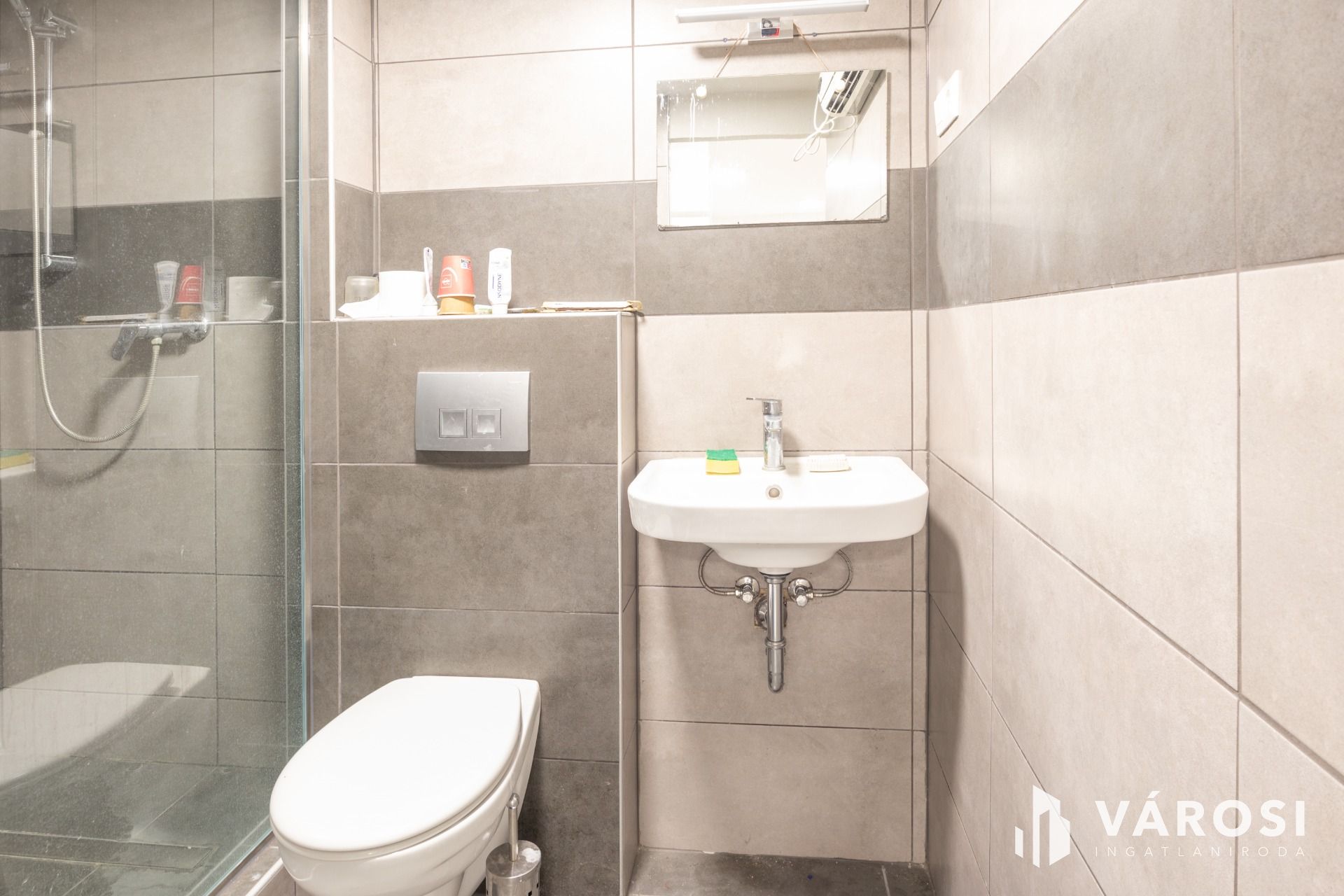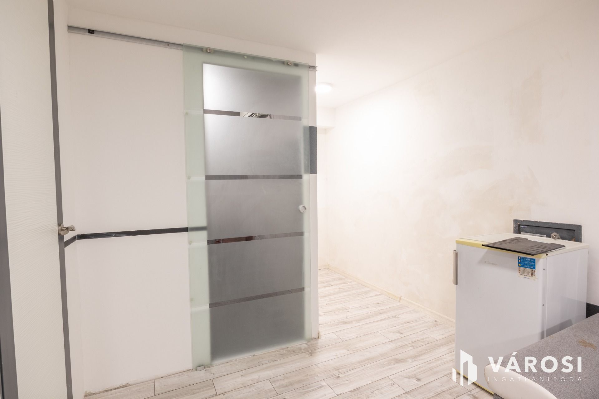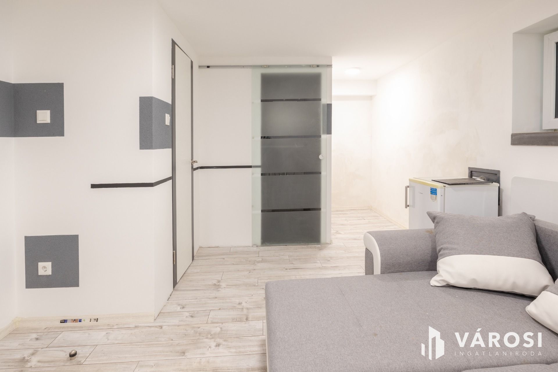 A lakásnak kialakított garzon laminált lappal borított. Tusolós fürdőszobájában kézmosó és WC található, praktikus helytakarékos üveg tolóajtóval szeparált.