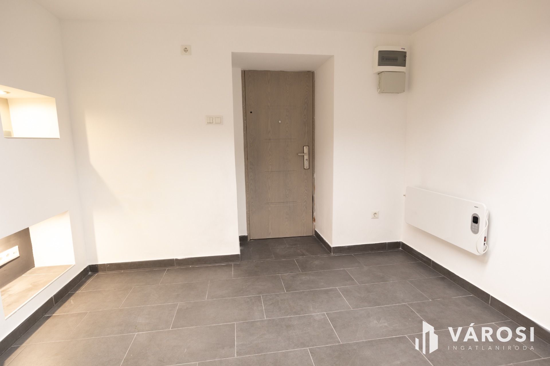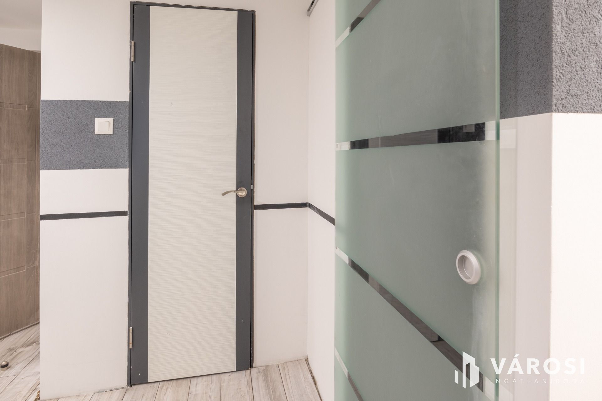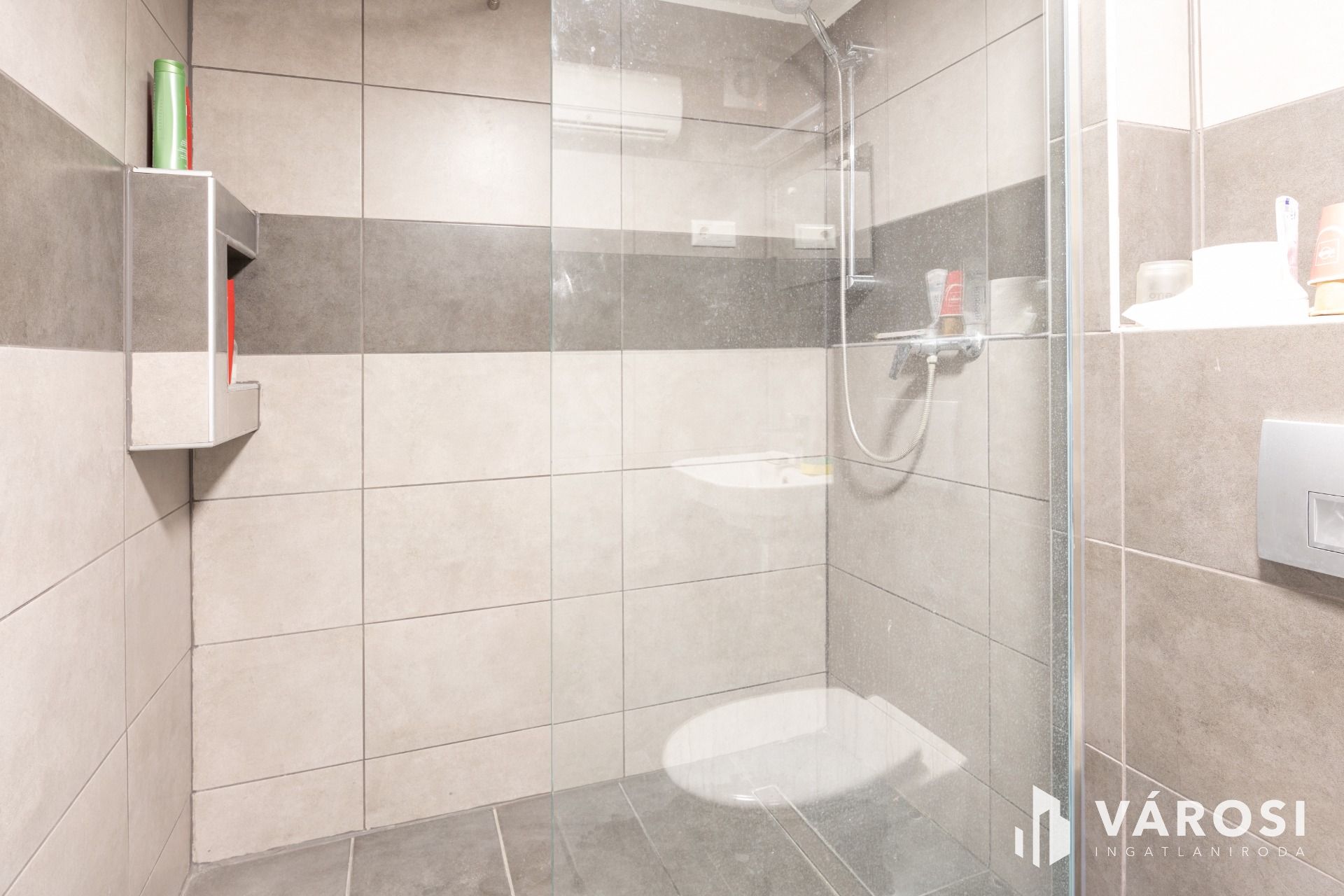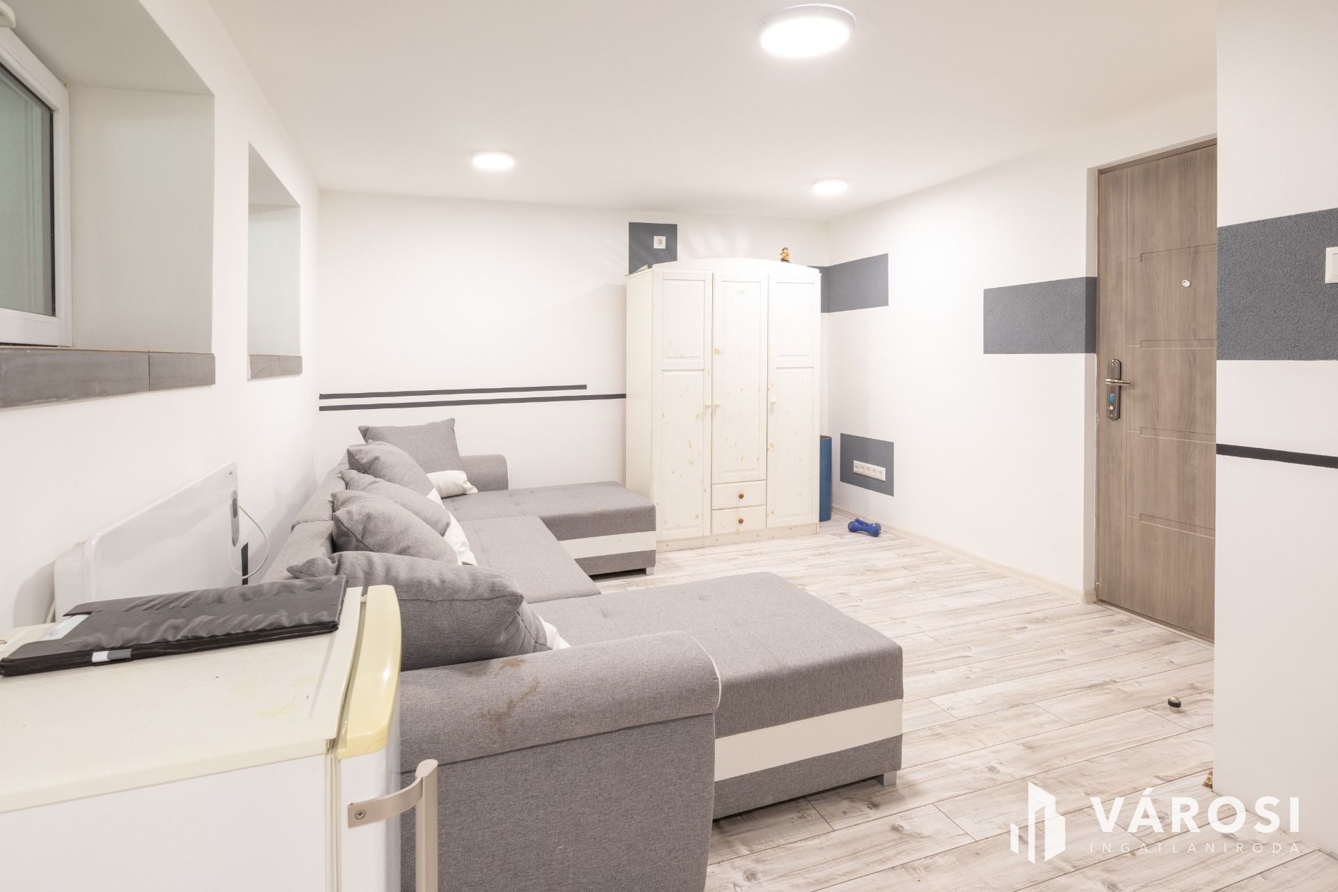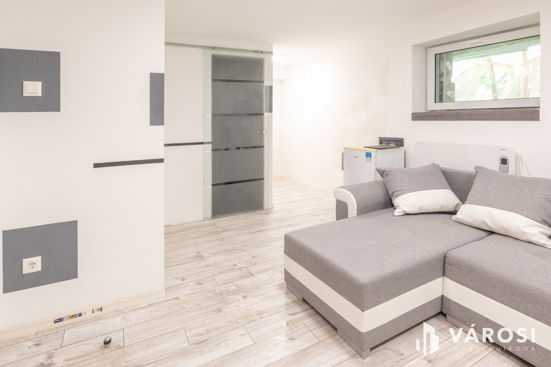 A lakásnak kialakított garzon laminált lappal borított. Tusolós fürdőszobájában kézmosó és WC található, praktikus helytakarékos üveg tolóajtóval szeparált.