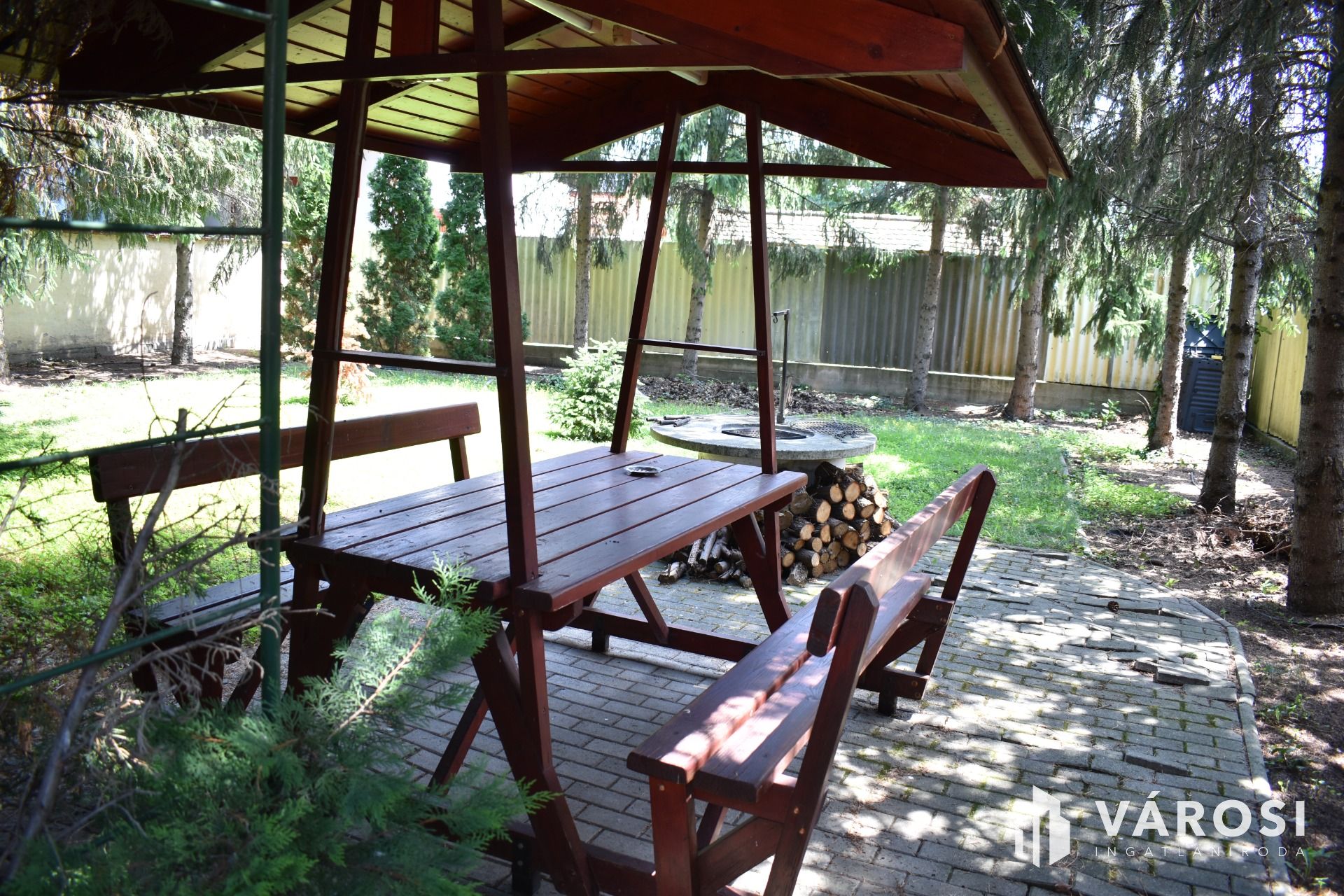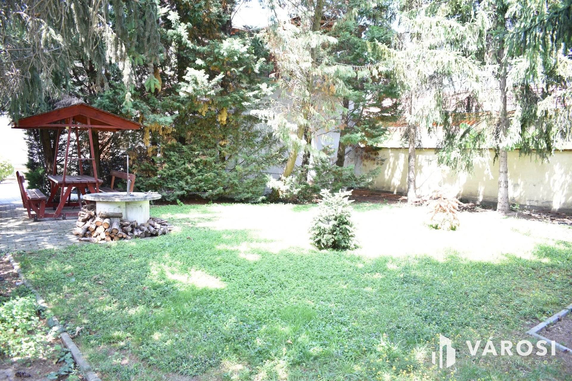 A ház igényesen körbekerített, parkosított udvarát egy kapun keresztül lehet megközelíteni, majd az udvar végén található dupla garázst használni. A garázsban villany, víz található. Az udvar végén egy hűvös, fákkal körbeültetett kiülő és egy szép sütő hely is ki lett alakítva.
