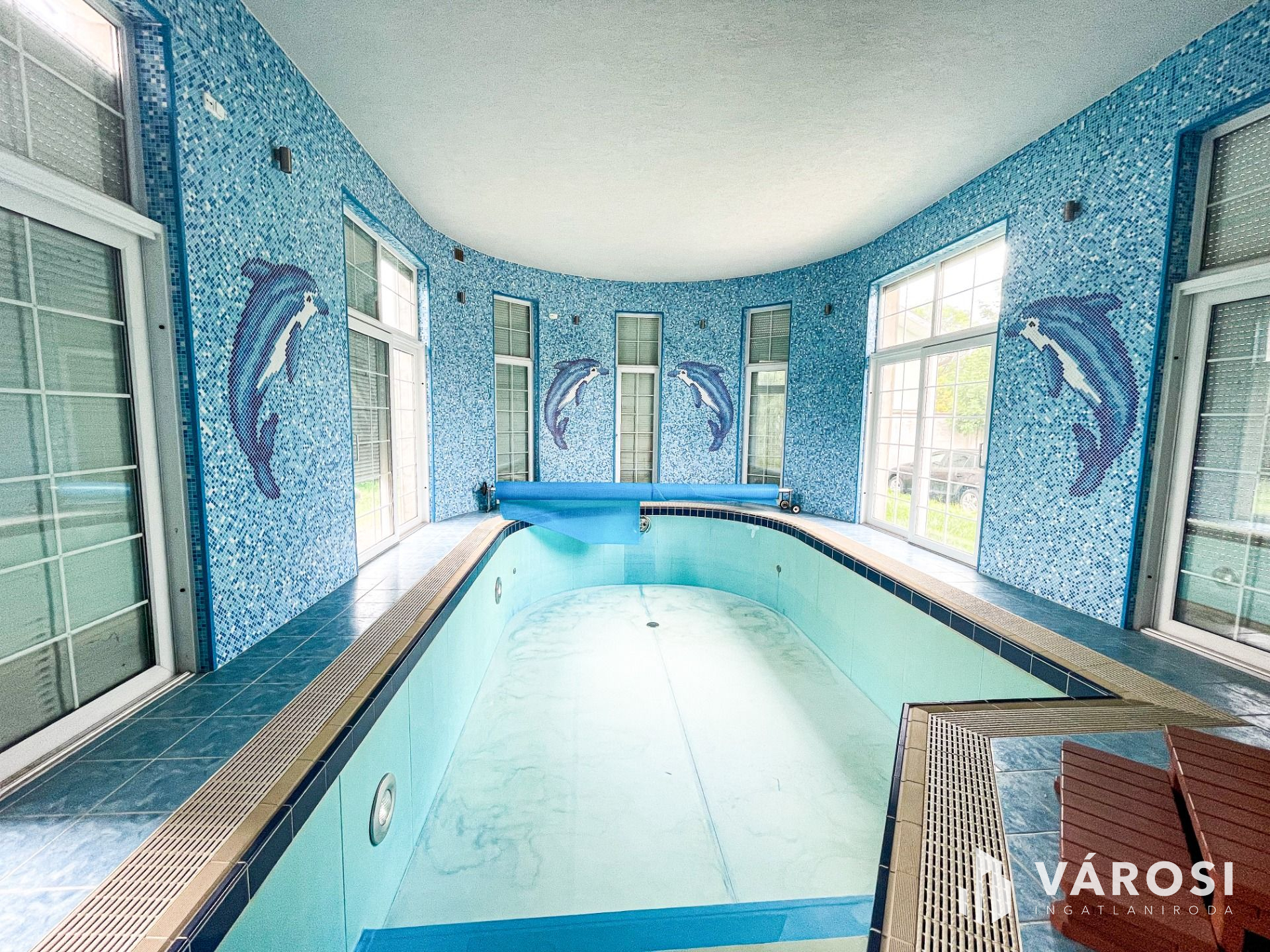 Szinteltolással a földszinten található egy 4 kocsibeállós fűthető garázs tárolóval, valamint beltéri medence szaunával és jacuzzi-val, illetve egy fürdőszoba.