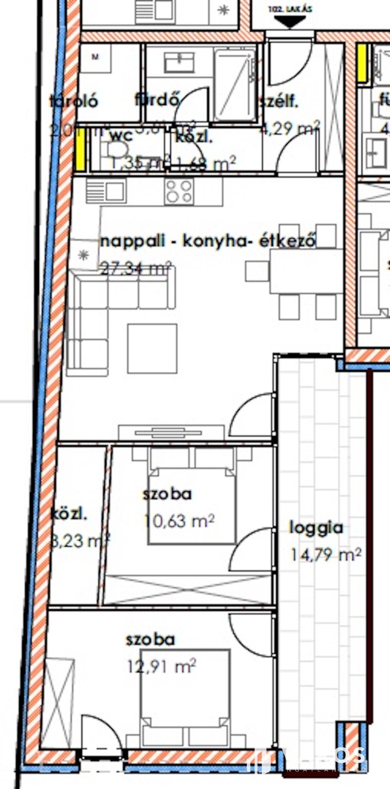Makón, presztizs lokációval rendelkező - Makói fürdőtől 30 méterre - a Szent János téren - A Napfény Residenceben - , Eladó egy most induló, tégla építésű, ELSŐ EMELETI , 81,84 nm-es élettérrel rendelkező, amerikai konyha nappali plusz kettő szobás loggiás lakás (102.lakás), liftes házban.