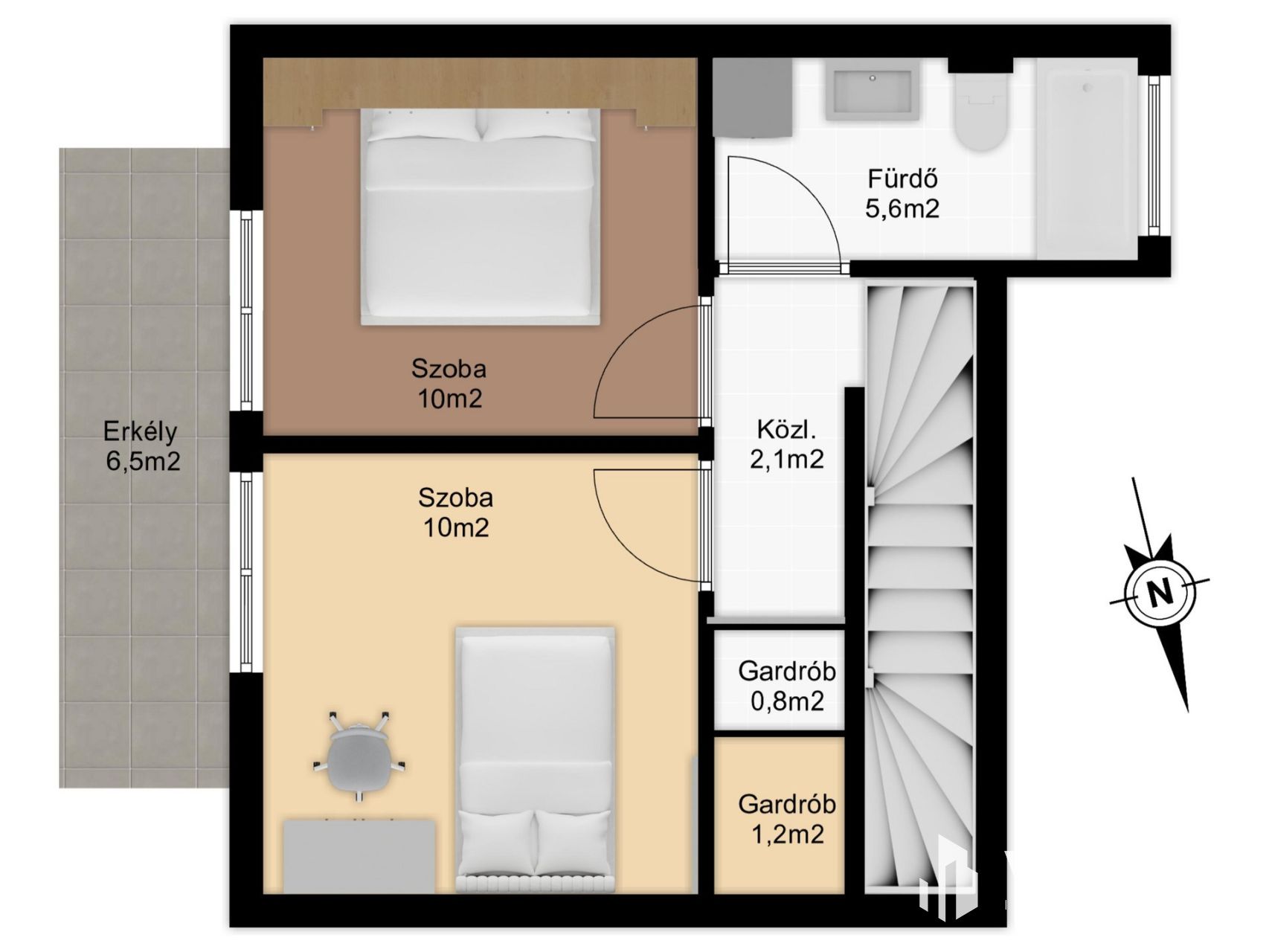 - Tárolás: Beépített szekrény és gardrób, saját és közös tároló biztosítja a helyet minden holmi számára.