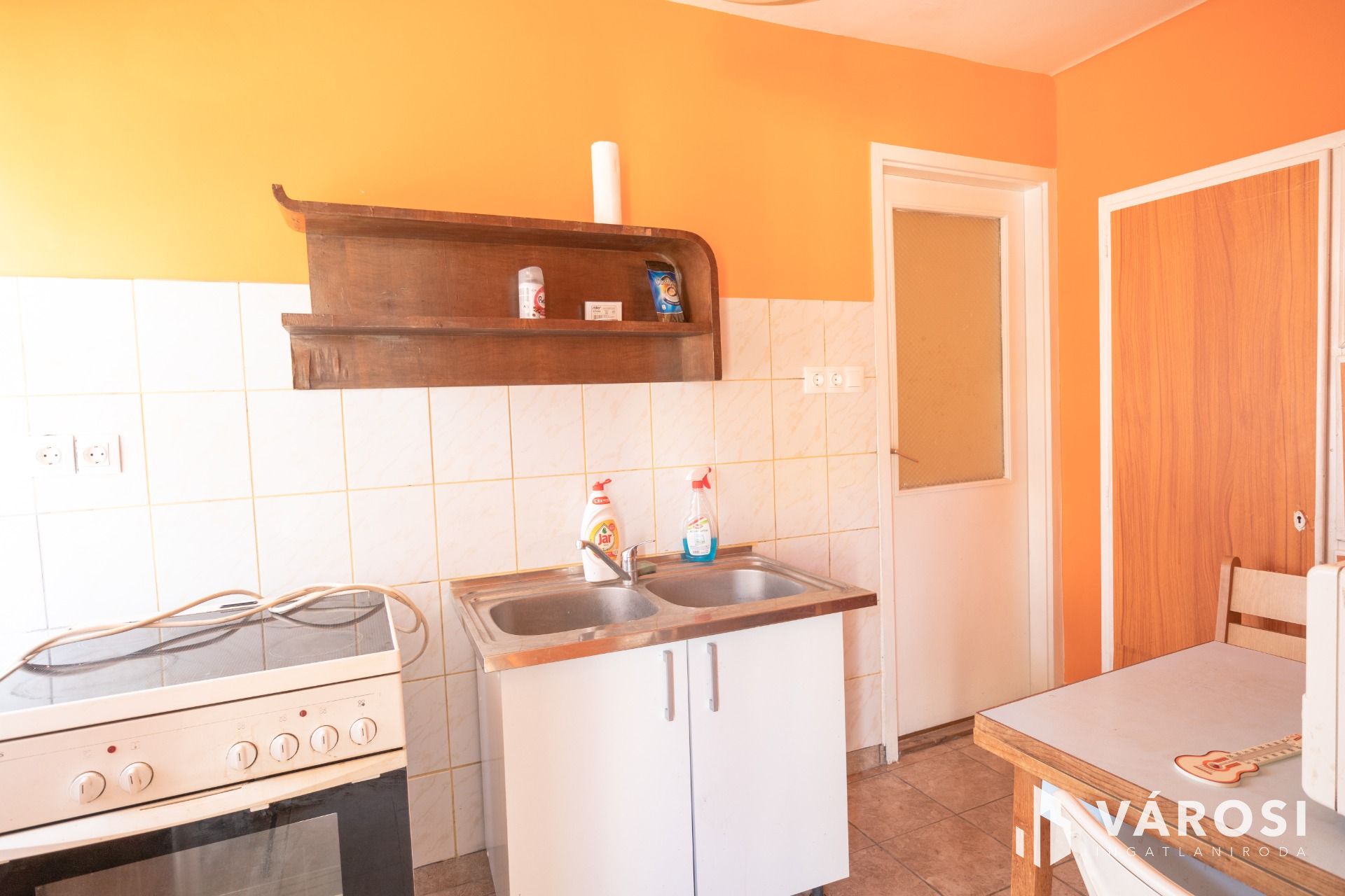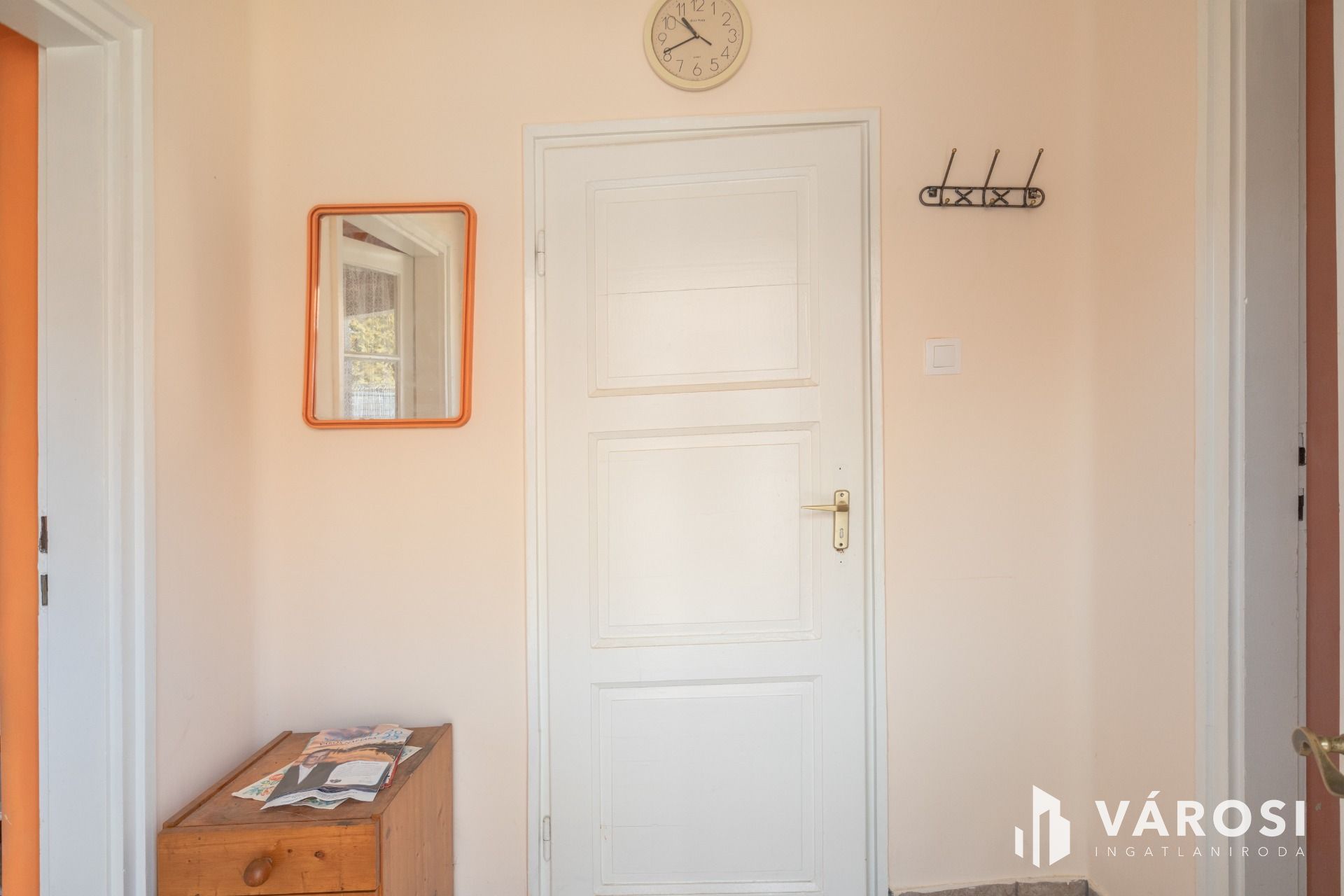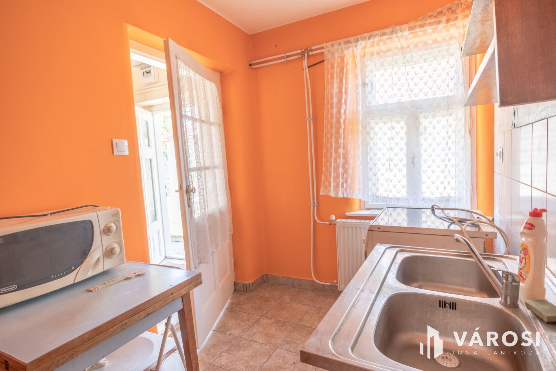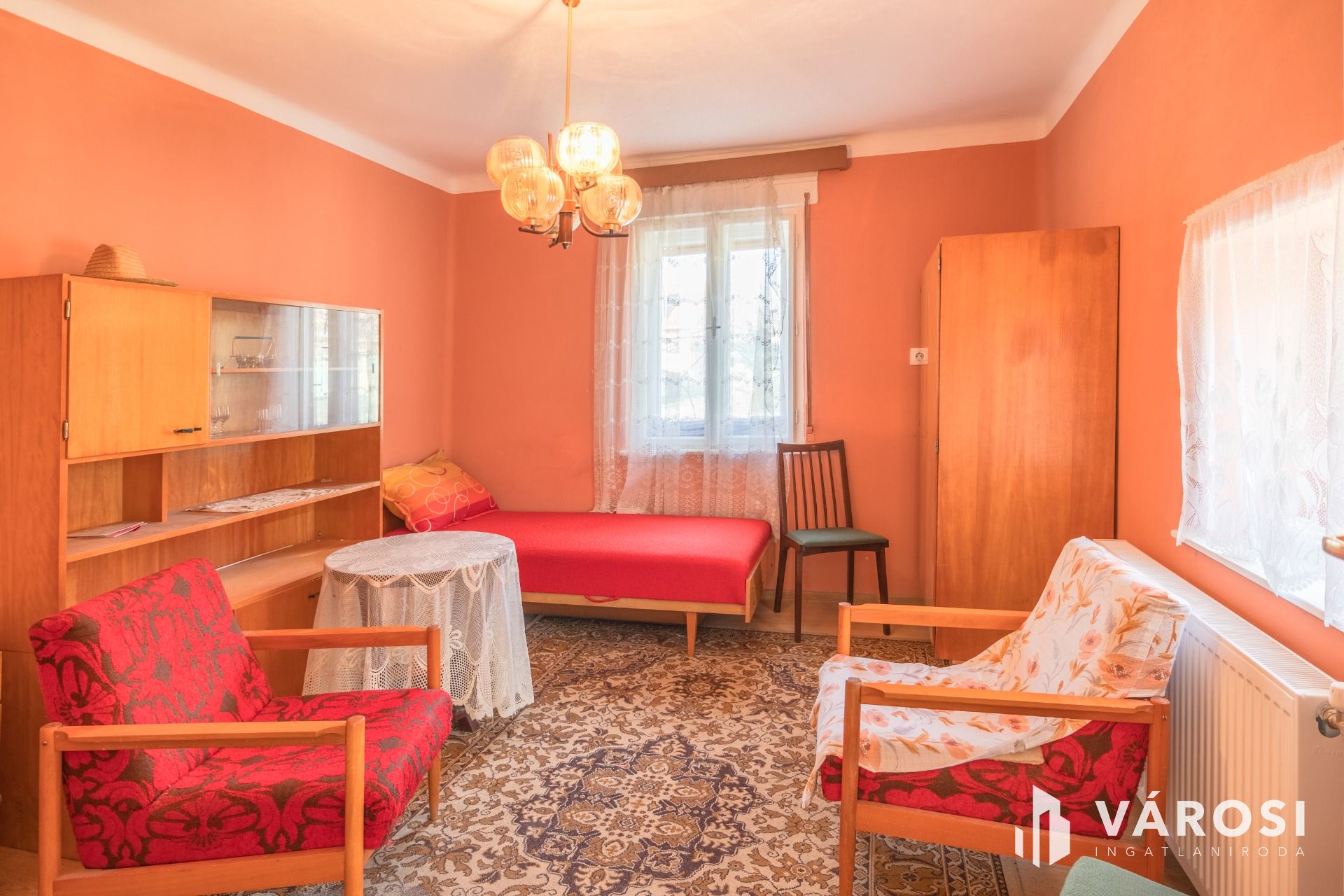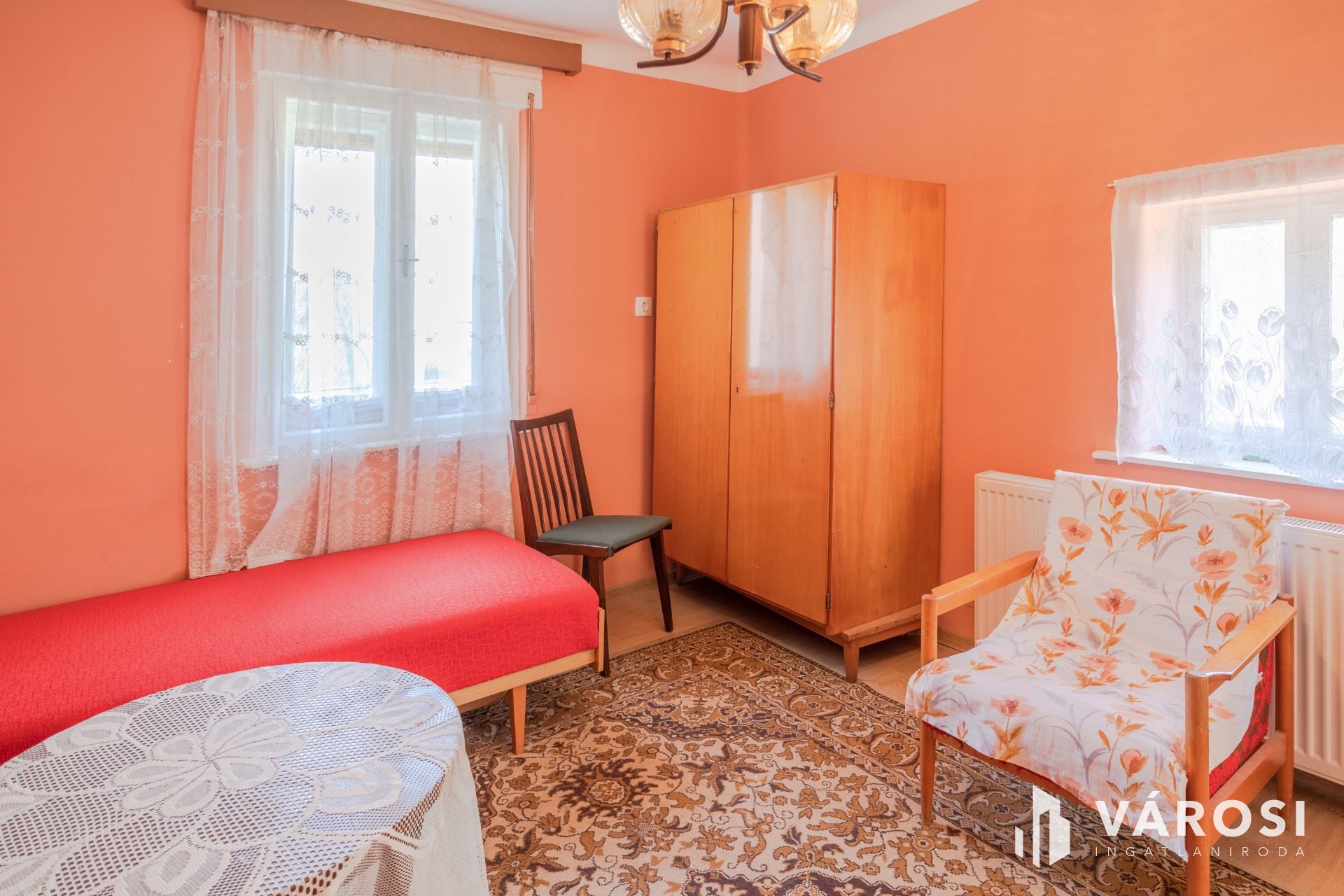 Jó állapotú fa nyílászárói vannak, a szoba nagyobb ablaka redőnyözött.