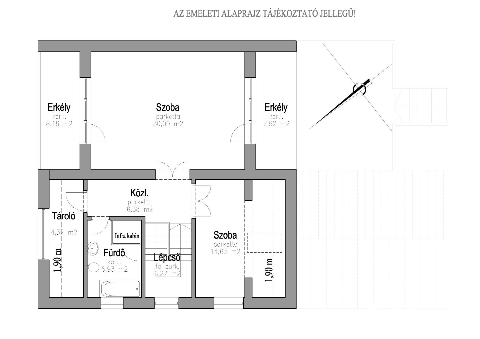 - Emelet: ~68,00 m2, Közlekedő, Fürdőszoba, Tároló,