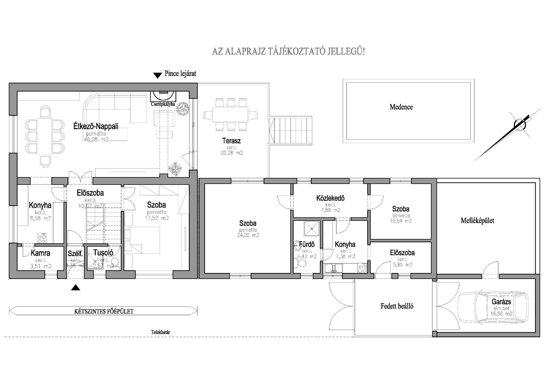 Az Étkező-Nappali alatt pince helyiség található, az épület tetején pedig napozó terasz.
