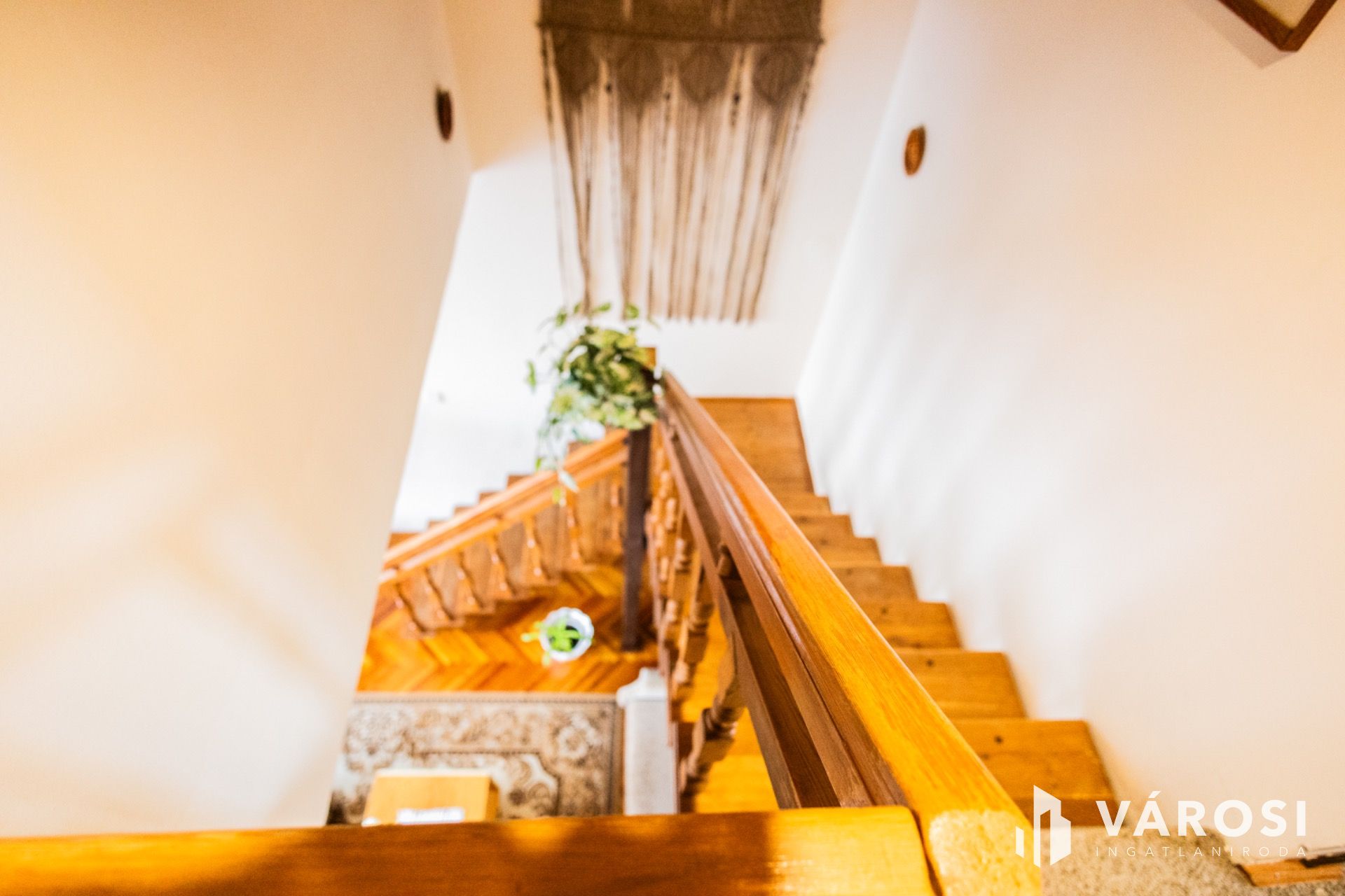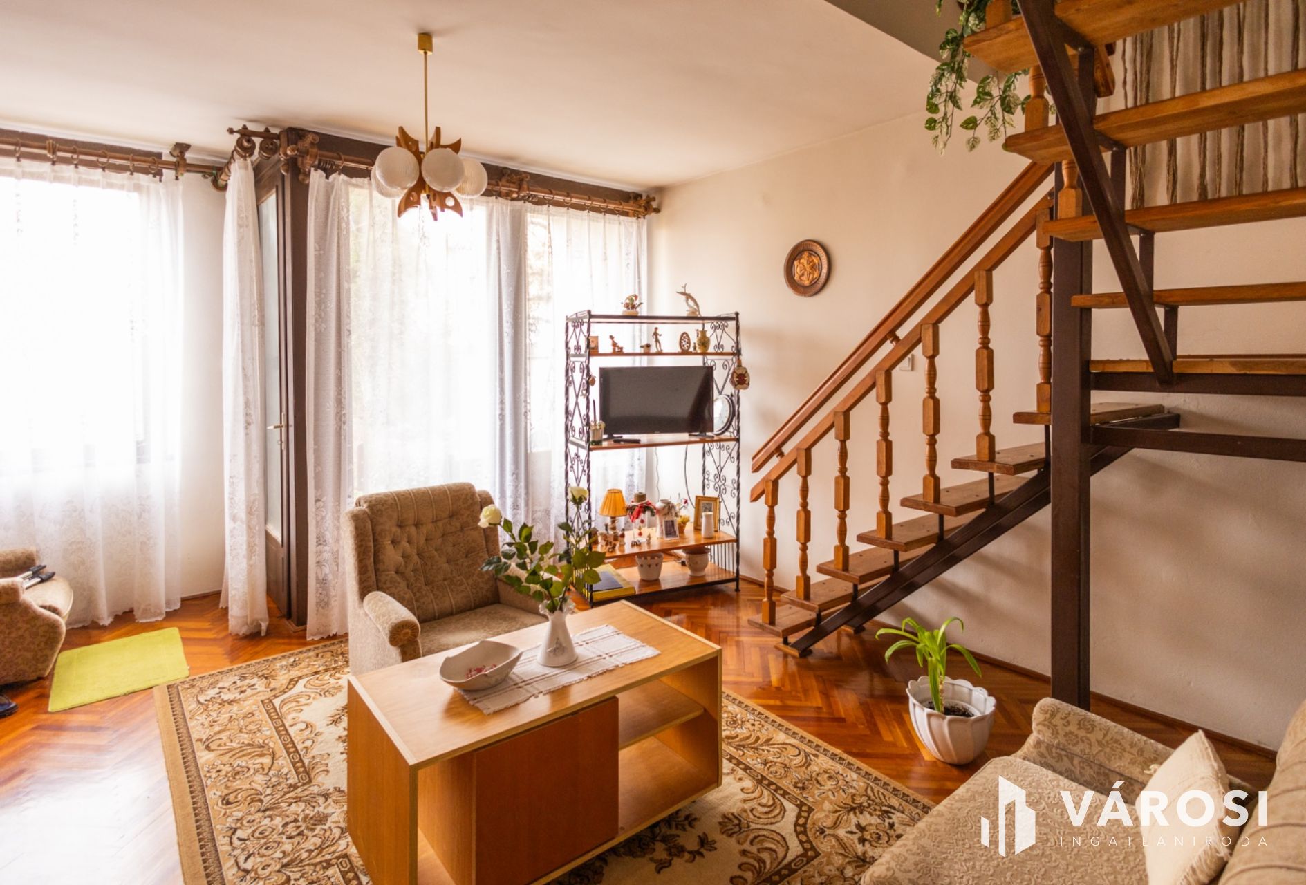 Az ingatlan beton lábazatra épült tégla falazattal, jelenleg is nagyon jó szerkezeti állapotban van. A lakás kétszintes, alapterülete 82 nm. A földszinten egy tágas nappali, külön fürdő és WC, konyha, kamra és egy előtér is helyet kapott. Az emeleti részen két szoba, fürdőszoba, WC és egy nagy gardróbszekrény is helyet kapott. Az otthon melegéről gázkazánról működtetett radiátorfűtés gondoskodik.. A kertet egy kis teraszon keresztül közelíthetjük meg.