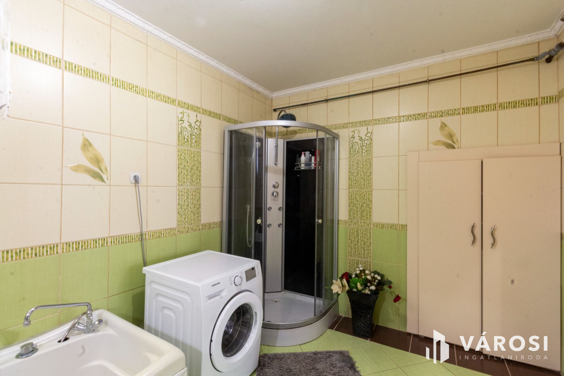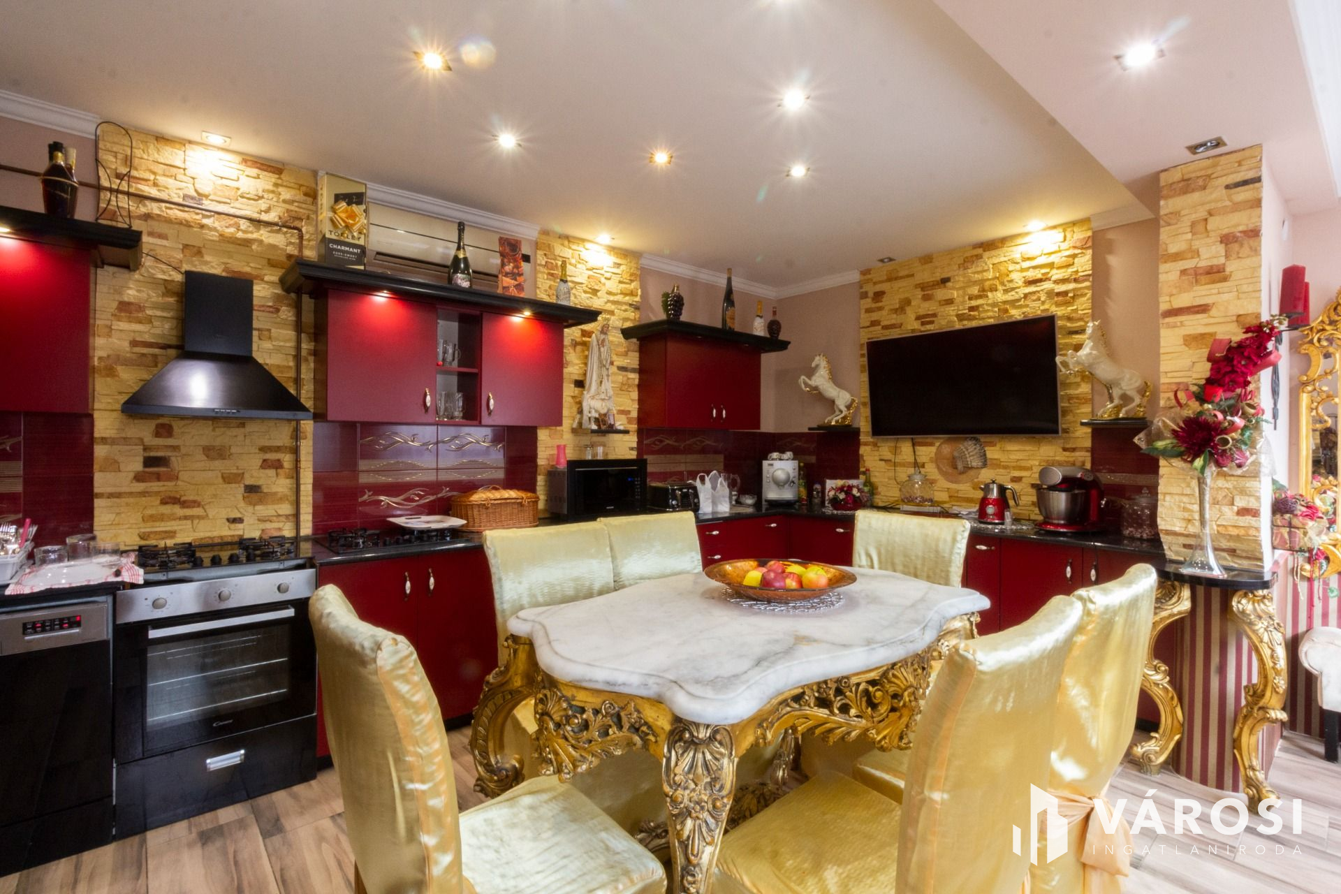 A lakásba belépve jobbra az amerikai konyhás étkező, balra pedig a nappali található, amelyből további két szoba nyílik. A szobák parkettások, a többi helyiség hidegburkolatú. Az L alakú ingatlan hátsó részében, külön bejáratú apartman lett kialakítva. Albérletnek kiadható lakrész.