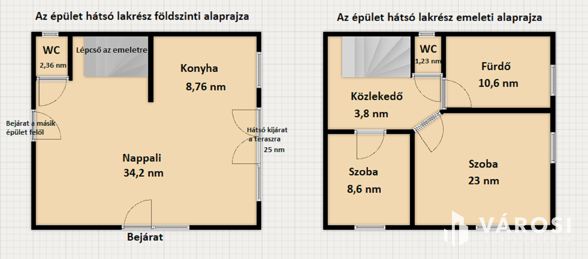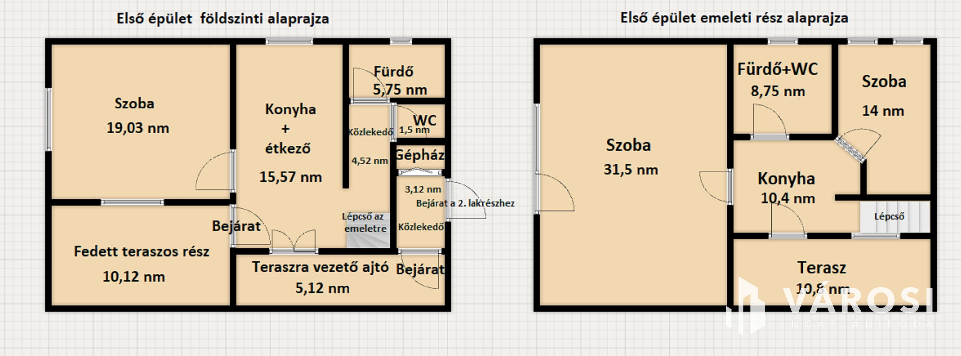 Az első ház, az összesen 130 nm nagy a kettő szintet egybe számolva. Az alsó szinten egy gyönyörű konyha+ étkező, egy szoba vagy épp nappali, egy fürdő és egy külön WC kapott helyet, ehhez az épülethez tartozik a gépház, amit a teraszról kilépve lehet egy másik ajtón megközelíteni. Ennek az épületnek az emeleti részén található egy nagy szoba/nappali és egy másik szoba is, ezekhez tartozik egy külön fürdőszoba+ WC is, a konyhából nyílik a terasz. Gépészete teljesen új, az egész ingatlan fel lett újítva. Az ingatlan állapota nagyon szép, igaz az emeleti részen a konyha nem került beépítésre, de a burkolatok mindenhol rendben vannak. Az épület minden helyiségébe padlófűtés található!