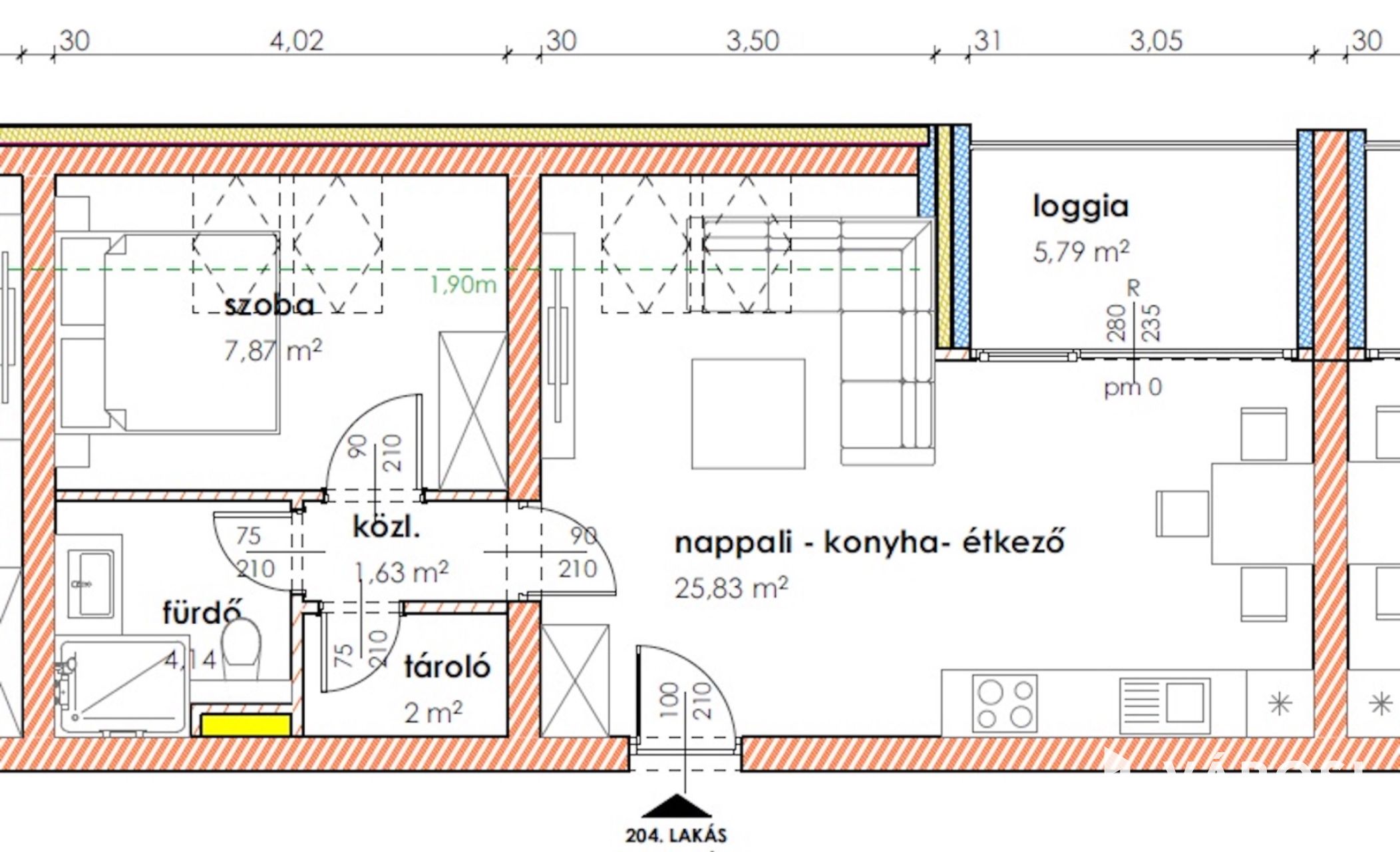 A 1 db amerikai konyhás nappalival, 1db hálószobával, 1 db fürdőszobával, közlekedővel, loggiával rendelkezik.