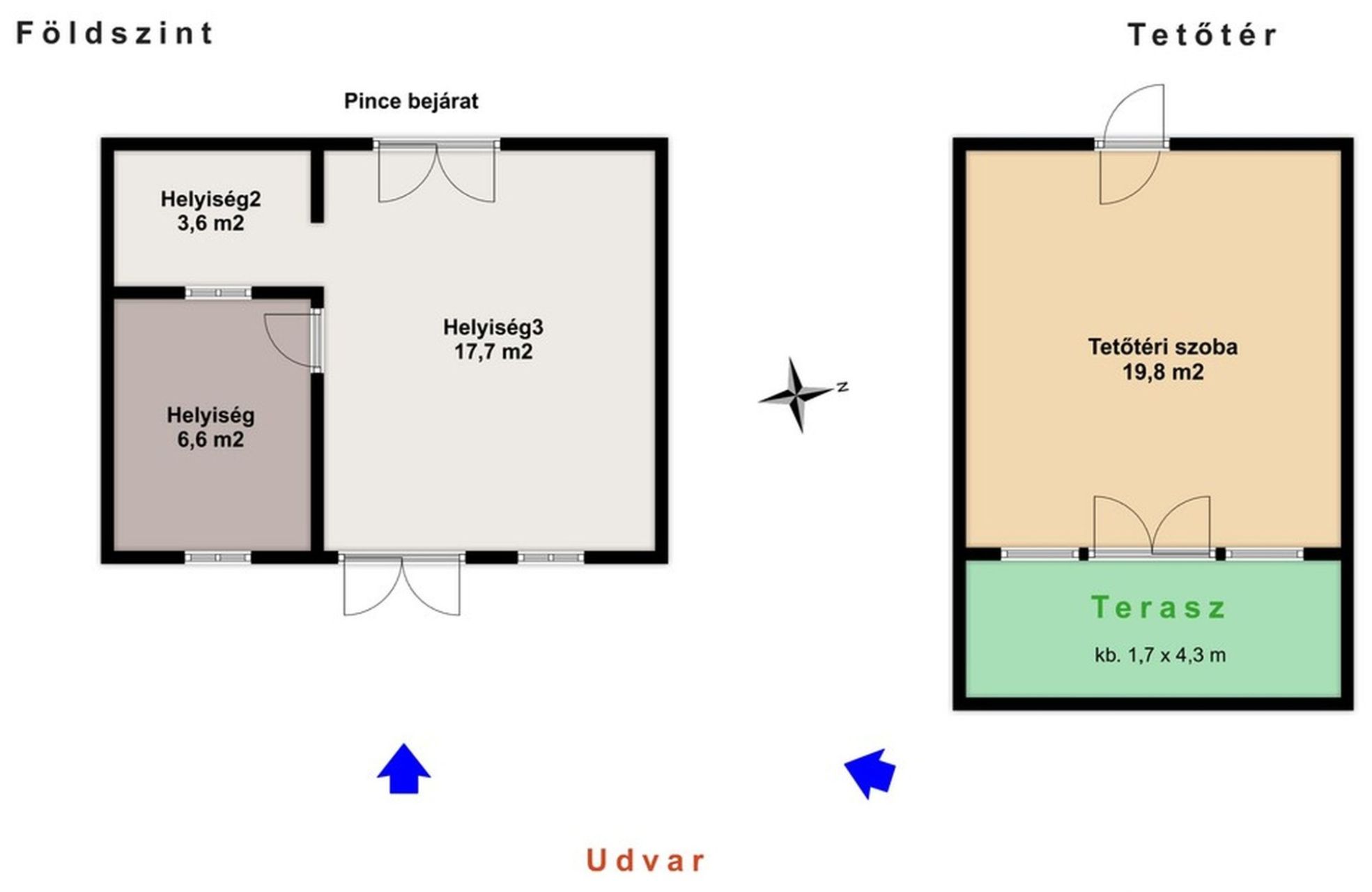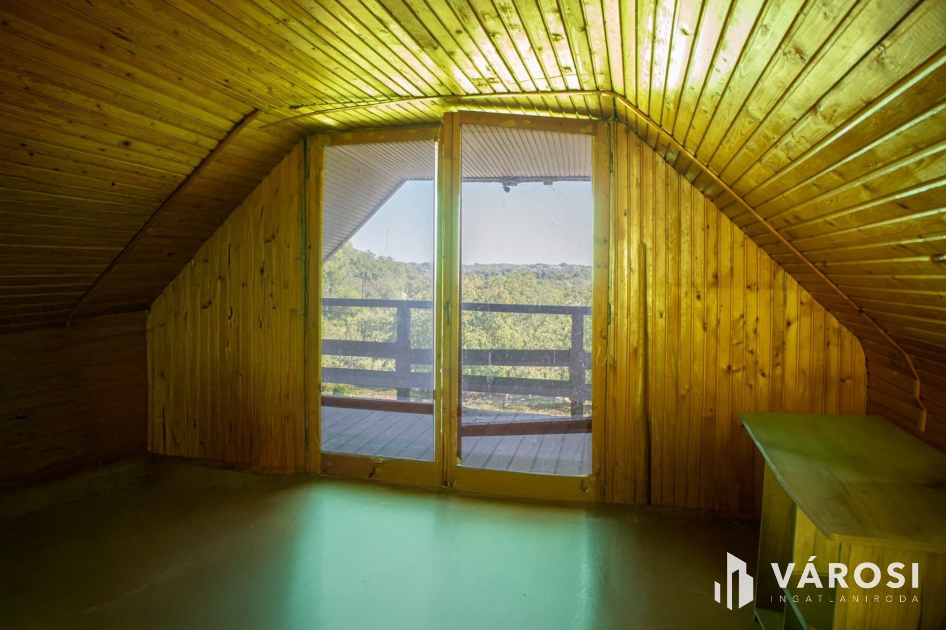 Az ingatlan fenti részén két különálló épület található, összesen 40 m2 alapterülettel. A présház jellegű épületek közül a nagyobbik (28 m2) 2 szintes, az alsó helyiségek fölött tetőtéri szobával rendelkezik. A 19,7 m2-es alapterületű szoba akár "háló / nappali"-ként kialakítható. A komfort érzetet nagyban növeli a széles, üveges 2 szárnyú ajtó, amely kivezető minket a erkélyre, ahonnan gyönyörű és pihentető kilátást élvezhetünk. Az erkély alapjának területe 1,7 M X 4,3 m. A tetőtérre a ház jobb oldalán lévő kis lépcső vezet fel.
