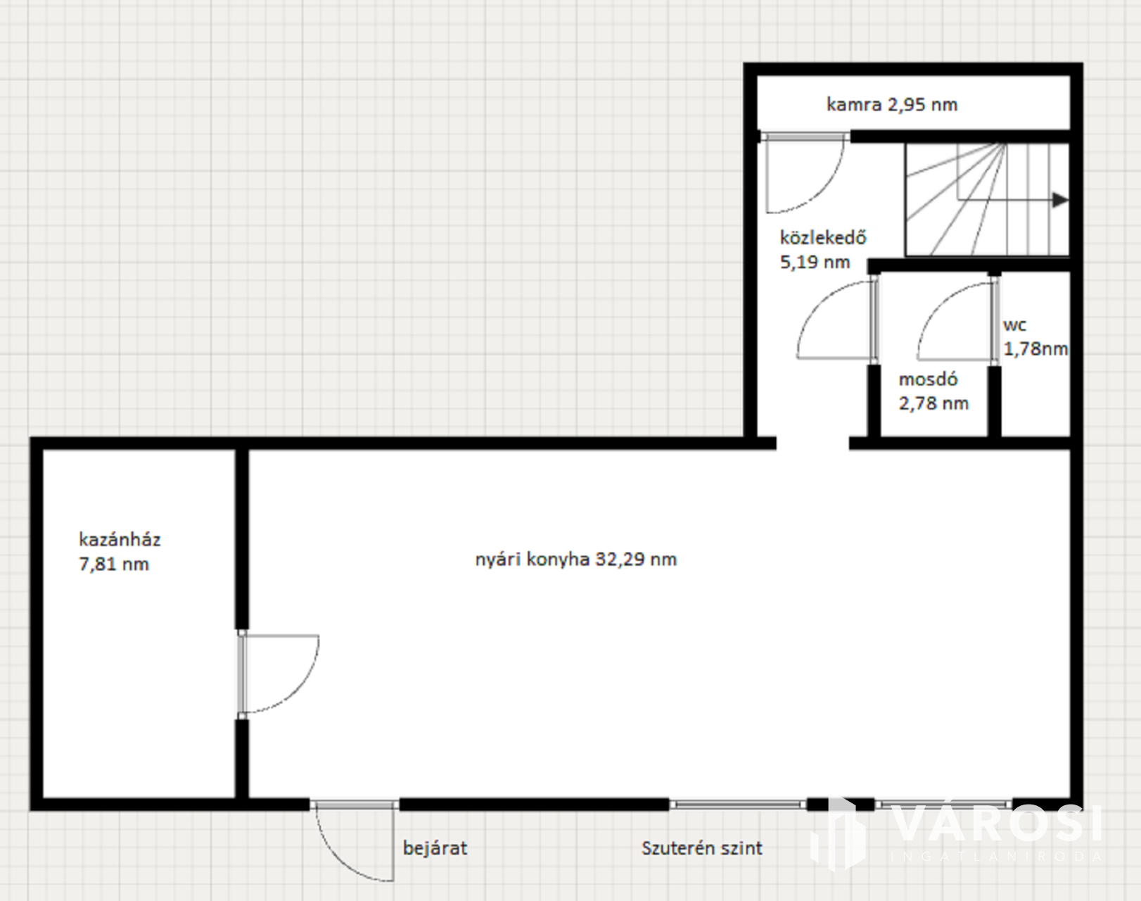 Szuterén szinten: kazánház, nyári konyha, mosdó, wc, közlekedő és kamra.