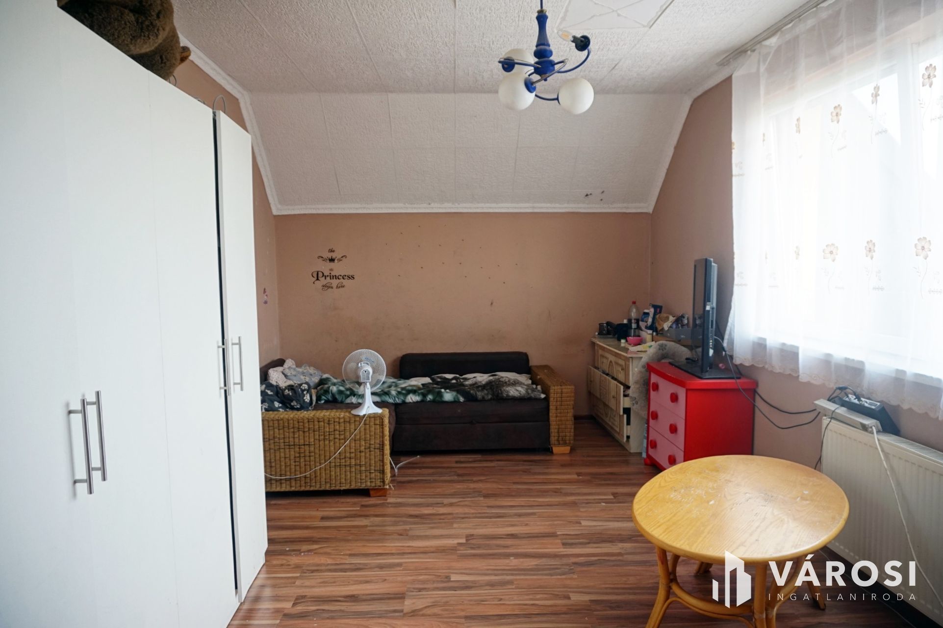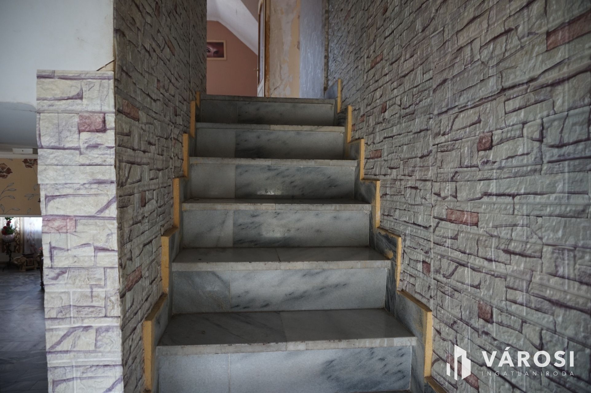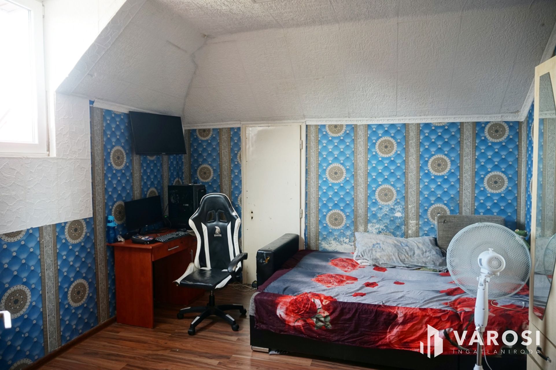 Felső szinten: 1 plusz fél szoba, közlekedő, fürdőszoba, wc, nappali.