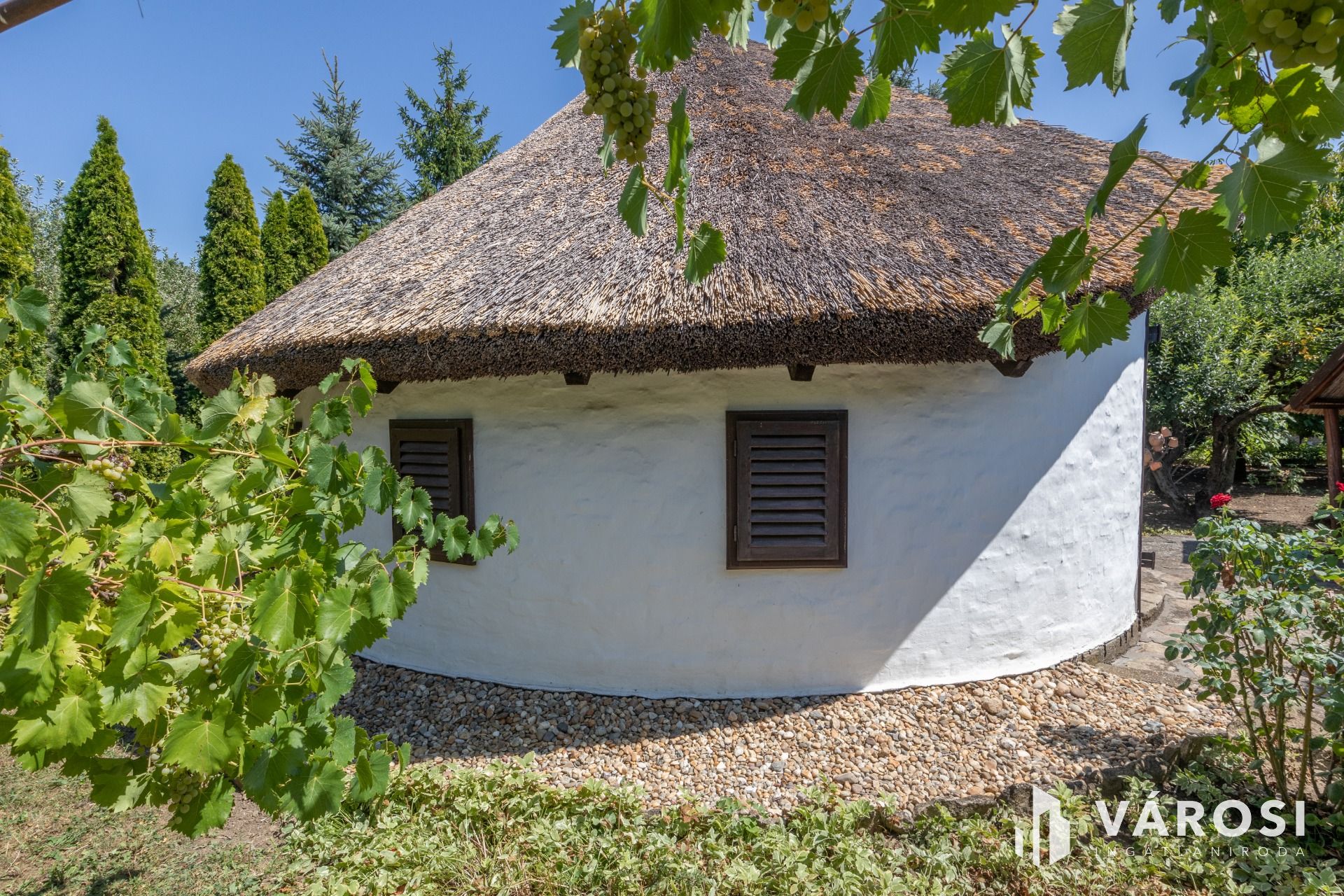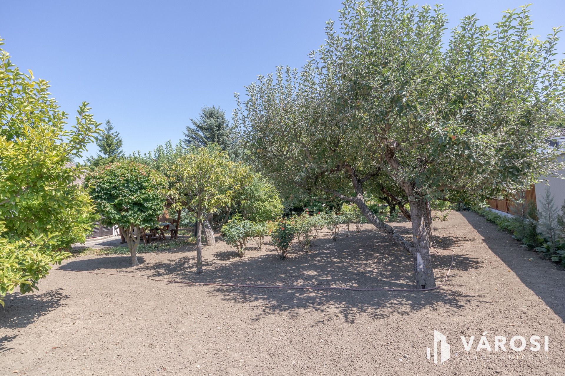 A telken gondozott termő gyümölcsös és dísznövények adnak árnyékot.